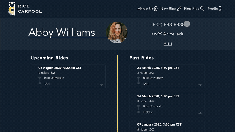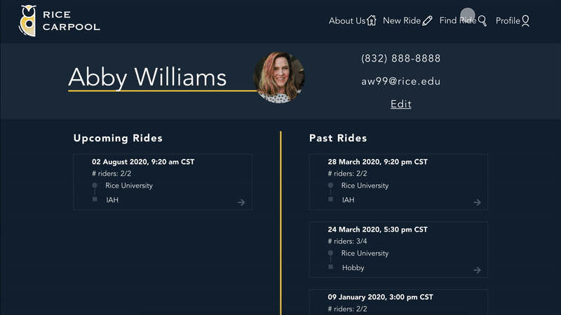 After logging in with Rice NetID, users can vew their past & upcoming rides.